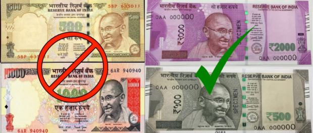 (left) Old 500 and 1000 rupee notes; (right) New 500 and 2000 rupee notes. Photo courtesy of Google Images.